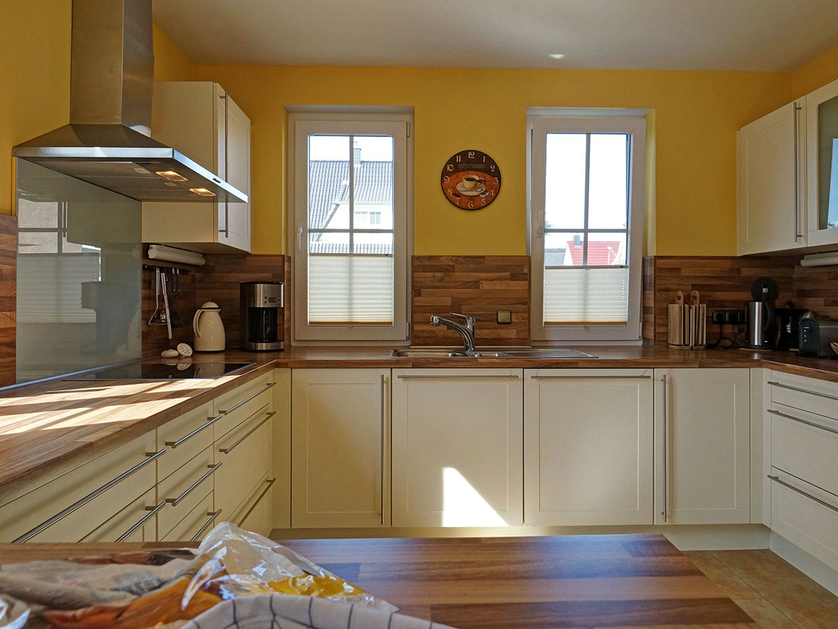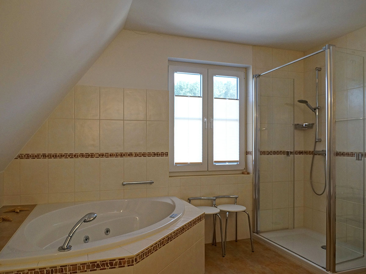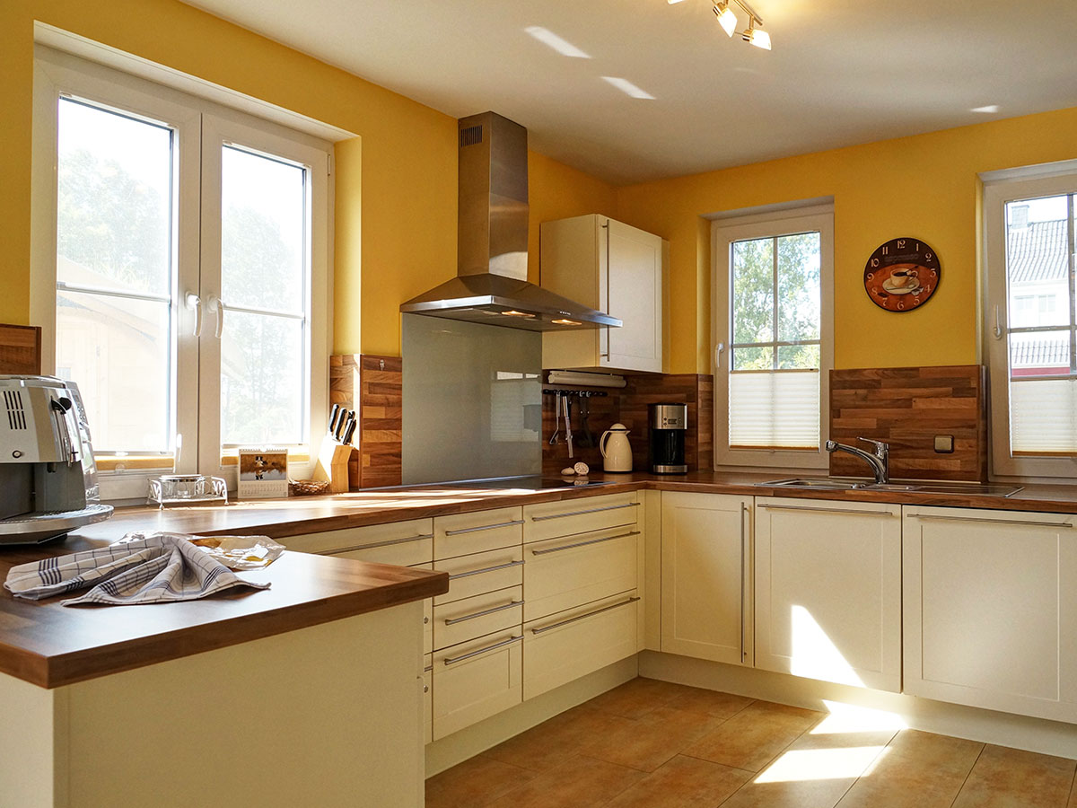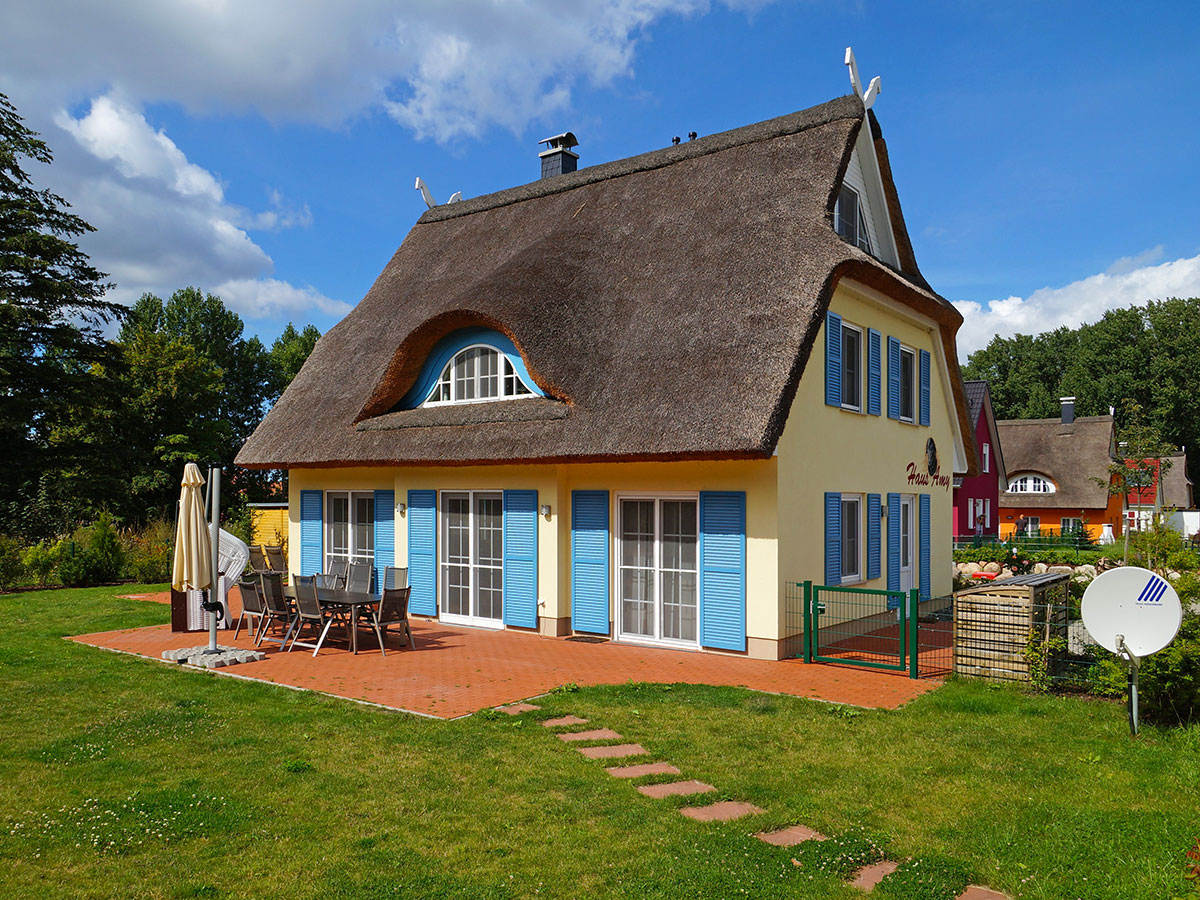 Das wunderschöne, großzügige Reetdachhaus "Amy" liegt nahe dem Ostseestrand in der neu angelegten Ferienhaus-Siedlung "Ostseepark Glowe". Es hat ein Wohnfläche von ca. 150 m² und ist modern und familienfreundlich eingerichtet. Im komplett gefliesten Erdgeschoss befindet sich der großzügige Wohn- und Essbereich mit offener Küche und zwei angrenzenden Terrassen. Das Obergeschoss verfügt über drei Schlafzimmer mit insgesamt sechs Betten für Erwachsene und eine zusätzliche Aufbettung für Kleinkinder. Im ausgebauten Dachgeschoss befindet sich ein viertes Schlafzimmer mit zwei weiteren Betten und einem Gäste-WC. Zwei Duschbäder eines mit Badewanne stehen Ihnen während ihres Aufenthaltes im Erd- und Obergeschoss zur Verfügung. Drei Pkw-Stellplätze befinden sich direkt auf dem Grundstück. Zur hochwertigen und modernen Ausstattung gehören selbstverständlich auch ein Kamin, Kaffeevollautomat, Stereoanlage, DVD-Player, mehrere LCD-Fernseher, Internetzugang per WLAN, Kinderhochstuhl, Kinderbett, ein Strandkorb, Sauna*, Wäschetrockner*, Waschmaschine* sowie eine 100 Liter fassende Tiefkühltruhe*. Urlauber mit Hunden sind im Ferienhaus Amy gern gesehene Gäste. Denn schließlich möchte man die schönste Zeit des Jahres nicht ohne sein vierbeiniges Familienmitglied verbringen. Um den Hunden möglichst viel Freiheit zu bieten, ist das Gelände um das Ferienhaus komplett eingezäunt. Das Ferienhaus ist ein Nichtraucherhaus und daher auch für Allergiker geeignet. |